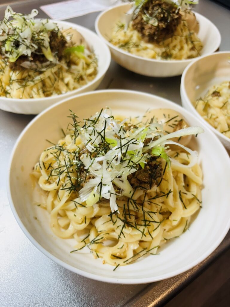 まぜそば風うどんです。夏の疲れたお腹にも優しいですね。(^_^)